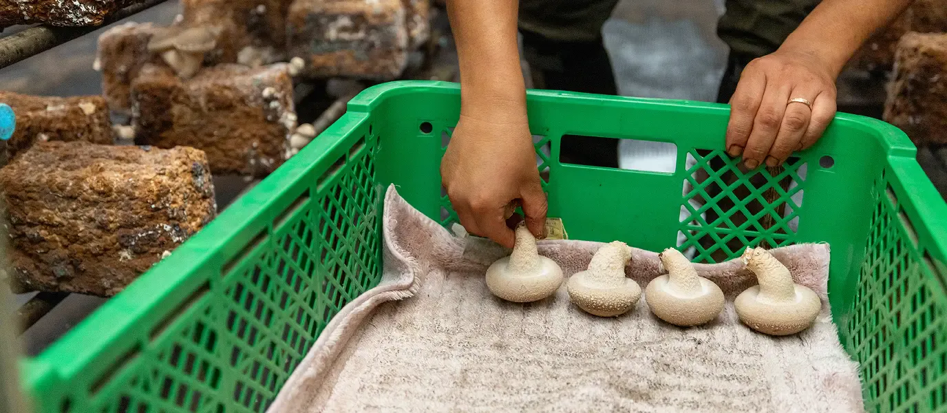 しいたけの品種(種菌)は様々ありますが、ベルマッシュでは選りすぐりの種菌を菌床に植え付けて栽培しています。こだわりの品種に、独自の栽培方法を掛け合わせることで「すずきのこ」が生まれます。収穫作業は一つ一つ手作業で行い、収穫したしいたけに傷がつかないよう、丁寧に運びます。